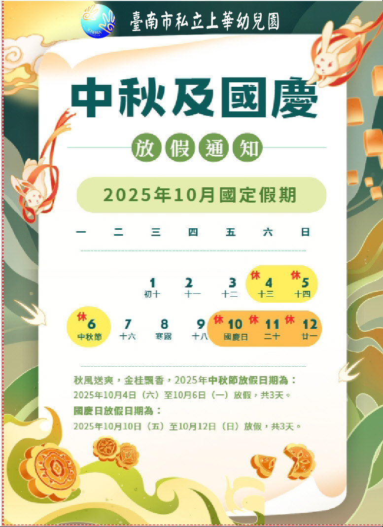 🌕10/04(六)至 10/06(一), 為中秋節連假,放假三天,全日不上學。